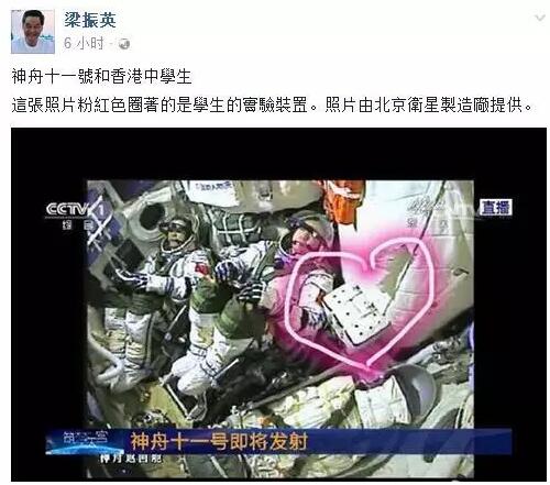 梁振英写道:今次神舟十一号搭载了香港中学生设计的三个太空实验。它们包括微重力状态下制作多用途的聚合物有孔薄膜、太空养蚕、微重力状态下双摆运动的混沌性质。这三个实验分别来自香港顺德联谊总会翁佑中学、基督教宣道会宣基中学、保良局罗氏基金中学的同学。同学们现时身在酒泉卫星发展中心,目睹其所构想的实验设备搭乘“神舟十一号”升空。这是首次有香港学生前往酒泉发射中心观看发射。