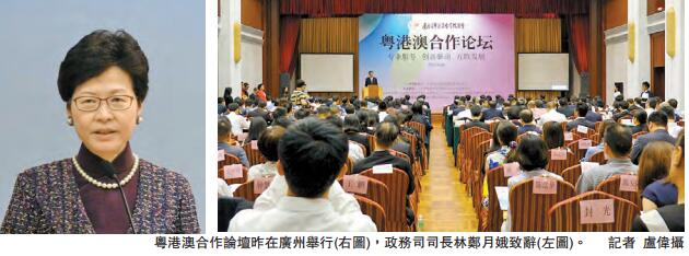 【香港商报网讯】记者卢伟广州报道:2016粤港澳合作论坛昨日在广州举行,主题是「专业服务、创新驱动、互联发展」。香港特区政府政务司司长林郑月娥、广东副省长何忠友、澳门特区政府经济局局长戴建业出席论坛并分别致辞。林郑月娥表示,会加强粤港沟通联系,推动两地创新及科技合作发展。何忠友称,将进一步深化与港澳在各领域的合作,降低进入门槛,为各界提供更具活力的发展平台和更便利的发展空间。