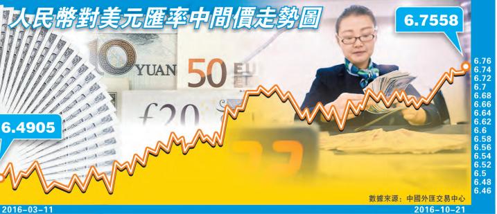 中國官方昨日開出人民幣兌美元中間價報6.7558,較上日大跌247點子。在岸人民幣跟隨中間價開市即跌穿6.75,中段一度跌穿6.76,低見6.7633,收報6.7599。離岸人民幣更跌穿6.76、6.77關口,徘徊6.7716。