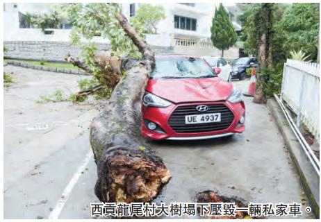 全港有大量樹木遭「海馬」吹倒,昨日中午12時許,銅鑼灣告士打道近景隆街行人路上,一棵約20米高大樹突然倒塌,壓毀欄杆後,橫告士打道路中,告士打道西行7條行車線中,共5條行車線受阻,幸無人受傷。昨午1時許,荔枝角消防局對開兩棵約30米高大樹,疑難耐強風吹打,均被連根拔起塌下,分別壓毀停泊局內的一輛私家車及停泊在路邊表位的私家車;此外,西貢龍尾村昨晨亦有大樹塌下壓毀一輛私家車。