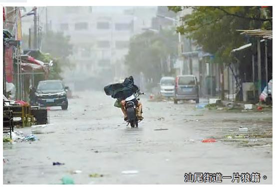 汕尾在狂風暴雨下,街上滿布雜物,多處馬路上的護欄倒地,路邊許多摩托車被吹倒,,大量樹枝樹葉被大風剝落散在道路上,全市高速公路臨時封閉,還一度導致7、8個鄉鎮斷電。紅海灣*門港掀起數米巨浪,而臨近的汕頭南澳島海邊海浪更大,幾乎淹沒巨型輪船。