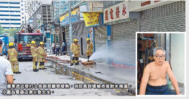 現場為旺角廣東道901號近登打士街一間電器維修店對開行人路地面。昨晨8時許,警方突接報指上址地面離奇高溫發熱,倒水后會冒「白煙」,恐有爆炸危險,警員隨即聯同消防人員到場調查。消防員利用紅外線測溫儀,測錄到地表溫度達攝氏70度高溫,事不尋常;打開行人路多個渠蓋視察,亦見有「白煙」冒出,遂將現場一帶行人路暫時封閉及開喉灑水降溫戒備,另又通知中電及煤氣公司派人到場協助追查是否涉及地底高壓電纜或煤氣管道等。