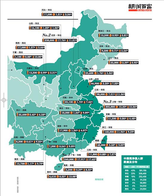 而從地區分布看,華東地區千萬富豪所占比例最高,達43%;華北第二,占23%;華南第三,占19%。西南、華中、東北、西北四地總和僅占15%。