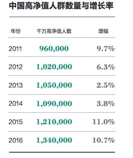 胡潤研究院最新的報告顯示,自2011年至今,中國高凈值人群人數連年增長,截至2016年5月,中國大陸地區千萬資產的高凈值人群數量約134萬人,較去年增加13萬人,增長率達10.7%;上億資產的高凈值人群數約8.9萬,較去年增加1.1萬人,增長率高達14.1%。