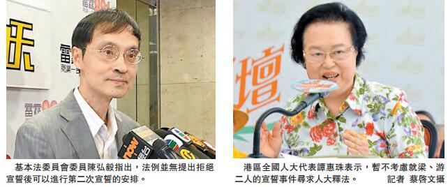 另外,基本法委员会委员、港区人大代表谭惠珠在港台节目《城市论坛》中表示,目前暂不考虑就梁、游二人的宣誓事件寻求人大释法,并指目前本港的司法制度及法例足以解决问题;但如果事件遇上「死结」,人大会否释法,将是宪制决定。