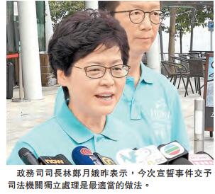 【香港商报网讯】记者周伟立报道:梁颂恒、游蕙祯二人日前於立法会宣誓时「辱华宣独」触发极大民愤,连日来毫无悔改且变本加厉。昨日,政务司司长林郑月娥首度开腔评论事件,形容今次事件属「大是大非」,反问如有人宣誓时「擘大眼讲大话」应否赋予特权参与管治。她重申特区政府特别是行政长官不能视而不见,必须履行宪制功能,执行《基本法》提出司法覆核,而由司法机关独立处理是最适当做法。法庭独立处理是最适当做法林郑月娥昨早出席活动后主动提及,梁颂恒及游蕙祯2位候任议员未能依法宣誓,律政司司长上周二启动了两个司法程序。第一个是针对《立法会条例》第73条,如果有一些根本没有拥有履行立法会议员职责的人士去履行立法会议员的工作,律政司司长可以提出禁制令,但法院考虑各方面因素后没有批出临时禁制令,她对此表示尊重。