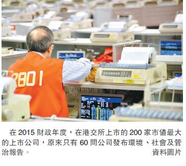 【香港商報網訊】記者譚之穎報道:自港交所上年要求加強環境、社會及管治披露的報告后,至今仍有七成上市公司都未應港交所要求全面公開資料。一項調查報告顯示,在2015財政年度,在港交所上市的200家市值最大的上市公司,只有60間公司發布環境、社會及管治報告,而且只有25%的報告披露所要求環境及社會政策中的全部指標。