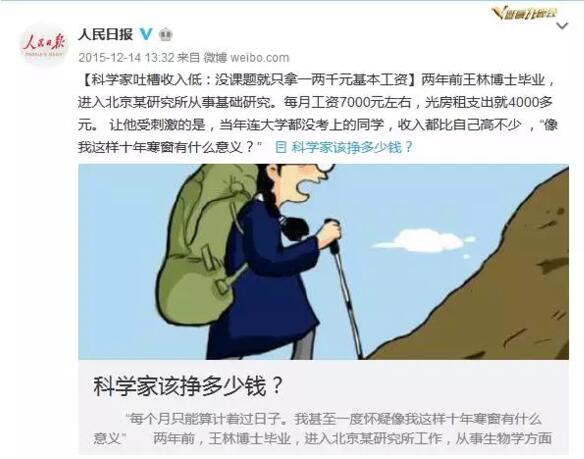 “作為重點科研單位,我們的收入與社會其他行業相比正逐漸失去優勢,員工幸福指數不斷下降,面臨人才流失風險。國有科研單位是我國技術創新的主力軍,希望對重點科研單位合理測算工資總額,加大對科研單位支持力度,減少對經濟指標的考核,鼓勵創新試錯。使科研人員收入與任務壓力和創新發展需求相適應。”2016年9月13日,一位網友在中國政府網的“我向總理說句話”中這樣向國務院總理李克強建言。