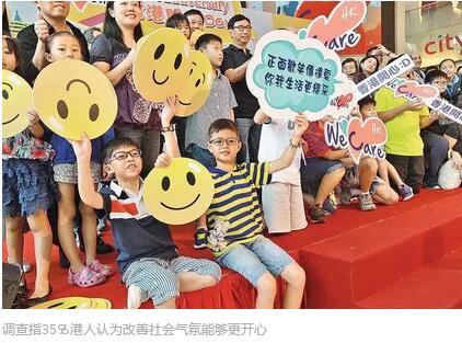 另有一项调查指,76%港人都觉得目前生活不开心,35%人认为改善社会气氛,可以更开心;其次为改善生活环境(28%)、工作环境(12%)及人际关系(12%)。
