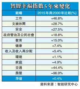 香港经济在过去15年虽有不少增长,实质人均本地生产总值累计增加逾五成,惟一项研究却指出,本港整体幸福度只上升0.4% (见表),反映经济发展未让市民活得更幸福,在11项不同范畴中,房屋负面影响最显着。