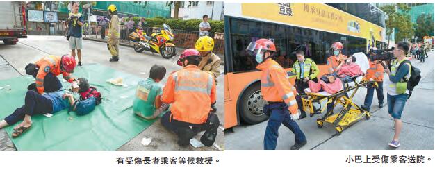 消防员接报赶至打开小巴车尾太平门,将伤者救出送院治理。其中小巴乘客朱先生被玻璃浶伤及颈部扭伤,经治理后可出院,他指事发时正乘车返工,坐在小巴后半部,车速正常不算快。当驶至现场路口时车上突有人大叫,接着巴士撞至,小巴翻侧后乘客人压人,有人大声叫痛。