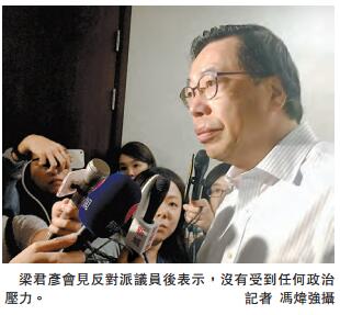 对於建制派议员要求他押後宣誓,梁君彦不认为是「逼宫」,他强调,没有受到任何政治压力,任何议员的意见都会聆听。他形容,现在需要「静一静,想一想」,一切决定会按法律及《议事规则》做事。