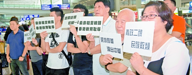 【香港商报网讯】记者潘仲男报道:本土激进分子梁颂恒、游蕙祯引发的宣誓事件连日来持续发酵。昨日,有市民专程赶赴香港国际机场等待两人由台返港,抗议及谴责两人远赴台湾宣扬「港独」,惟两人鬼祟离开,避开了抗议市民。昨日早上11时许,抗议者一行10多人陆续低达香港机场,并在抵达离境大堂B区等候梁游二人出闸,各人均举起「港独要自绝,港人不陪葬」蓝色横幅。另有同行抗议者手持「青政二丑,民族败类」、「梁游粗言秽语,香港教育幵辱」、「梁游辱华,滚出中华」、「港独台独,蛇鼠一窝」等标语牌。各人在离境大堂守候多时,惟一直未见梁游二人出现及离开机场。其后,抗议人士方从机场保安处得知,梁、游已经在离境大堂A区疾速离开。有参与抗议者愤然表示,无法接受两人发表否认辱华言论,更前往台湾宣扬「港独」。抗议者怀疑二人或知晓会有港人在机场狙击抗议,遂采取「逃避」态度,鬼鬼祟祟离开机场。