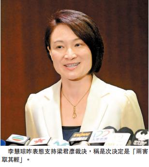 民建聯主席李慧昨表態支持梁君彥裁決。她稱,是次決定是「兩害取其輕」,既避免立法會可能成為散播「港獨」的平台,同時可以令議會繼續有效運作。她坦言,梁游是事件始作俑者,公然在宣誓時侮辱國家及民族,亦不肯道歉;二人極可能已違反《基本法》及《宣誓及聲明條例》。