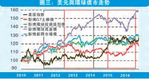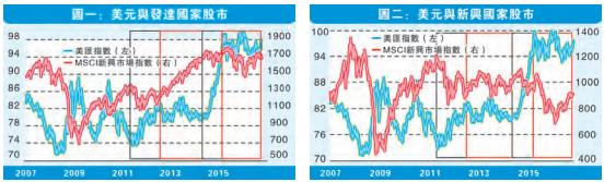 近年市場炒一個概念:美國上,新興市場落。有這說法是因為以往資金在金融海嘯間由歐美轉至新興市場。不過,當多年前聯儲局聲稱要收水,加上新興經濟開始滑落,資金返美。所以,如果今年餘下時間是炒強美元的話,跌的不一定是發達市場,而是新興市場。圖二見到,2011年后兩次的美元上升期間(黑框),新興市場股市都無運行。美元橫行,新興股市表現也好不到哪里去。所以,炒強美元沽股票,筆者都同意,但只限是新興市場。