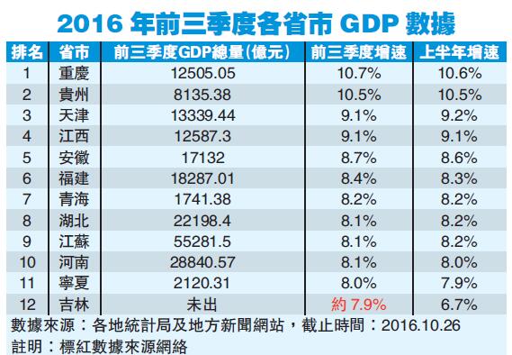 【香港商報网訊】隨著全國前三季度GDP數據的出爐,目前已有25個省市統計局公布了2016前三季度本省的GDP數據,另有吉林、黑龍江、山西3個省份的GDP增速也被網絡媒體陸續公布出來,但當地統計局還未公布官方數據。