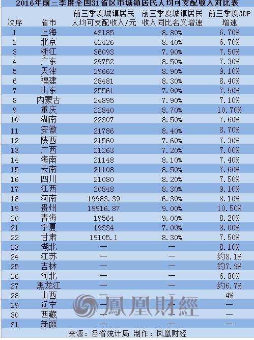 鳳凰財經訊 中國各省市2016年前三季度居民收入數據陸續出爐。據不完全統計,截至10月28日上午,全國已有22省份公布了前三季度城鎮居民人均可支配收入數據。其中,上海、北京城鎮居民人均可支配收入分別達43185元、42426元,是全國目前僅有的超過4萬元大關的地區。此外,7省市城鎮居民收入名義增速跑輸GDP。從全國來看,今年各地工資增速現呈現出減緩趨勢。
