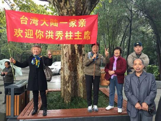 今早8点半,南京中山陵,大陆民众举横幅欢迎国民党主席洪秀柱一行。