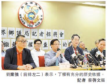 新界鄉議局主席劉業強昨於記者會上嚴正指出,民主黨該份調查指七成市民認為應廢除丁權在社會引起很大躁動,特別對新界群族引起極大震動,作為本局主席在此強調,男性原居民擁有丁權及丁屋政策由來,有充分歷史依據,在討論丁權是否應該撤銷時不能違背歷史。