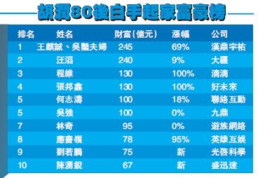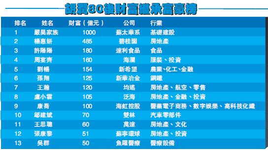 【香港商報網訊】胡潤研究院昨日發布胡潤百富榜子榜之一《2016胡潤80后富豪榜》,其中漢鼎宇祐36歲的王麒誠和35歲的吳豔夫婦以245億成為最富有的80后白手起家富豪。滴滴、美圖、餓了麼、聚美優品、今日頭條和學而思的創始人都上榜。個人財富50億及以上的接班人已有13位,以太平洋建設的嚴昊和碧桂園的楊惠妍為首,王思聰60億排到第11。