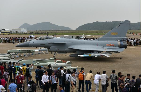 11月1日,观众在现场观看中国空军歼10B战斗机的静态展示。