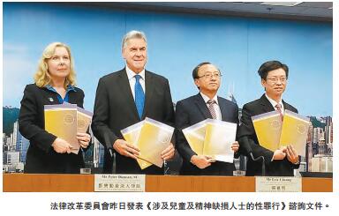 法改委辖下的性罪行检讨小组委员会昨日下午发表上述谘询文件。委员会主席邓乐勤表示,文件涵盖涉及儿童及精神缺损人士的性罪行,以及涉及滥用受信任地位的性罪行。这些性罪行大多关乎保护原则,为这些易受伤害的人提供更佳的保护,免遭性侵犯或剥削。