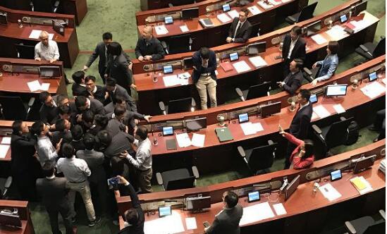 從法理角度而言,梁、游議員資格成疑,兩人亦無理由可進入立法會參與任何活動。然而就是這兩「镕雜人等」,竟然可以多次強闖議事廳,大鬧會場,昨更與立法會保安員發生激烈推撞,導致多名保安員受傷,立法會基於安全理由被迫休會,足見「港獨」分子已經囂張到了何等地步,直把立法會當法外之地,將自己當法外之人,部分反對派議員助紂為虐,護送梁、游強闖,顯然也是一丘之貉。從近幾次議事廳的混亂情况來看,不徹底解決宣誓風波,盡快把梁、游等「港獨」分子剔除出議會,立法會乃至特區政府的正常運作,都將受到嚴重困擾。基於香港的實際情况,在沒有就23條立法的情况下,光靠特區政府或特區內部的力量或措施,不足以讓「港獨」分子收斂,且「港獨」涉及國家層面,超出「港人治港」、高度自治範圍,由人大釋法才能最有效地起撥亂反正作用。