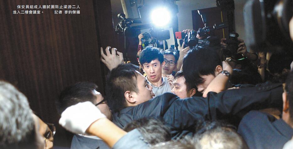 二度暂停后,梁游二人随即上到二楼,并打算硬闯会议室一。是次,二人被保安员多番阻止入内,不得其门之下还向传媒声称会暂停硬闯行动。