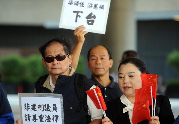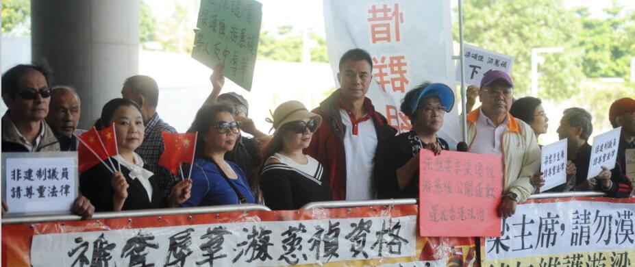 昨天法院门外,一众市民举行集会,他们手持「反辱华反港独」等纸牌横幅,并高喊「滚出立法会」等口号。他们说,全港市民有目共睹梁游二人的辱国誓词人神共愤,其宣誓时的态度和言行绝对是违背忠诚。