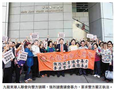此外,九龙东潮人联会昨日在会长杨育城、常务副会长吴光霖、副会长许展鹏带领下,到湾仔警察总部外递交请愿信,强烈谴责议会暴力,要求警方严正执法。