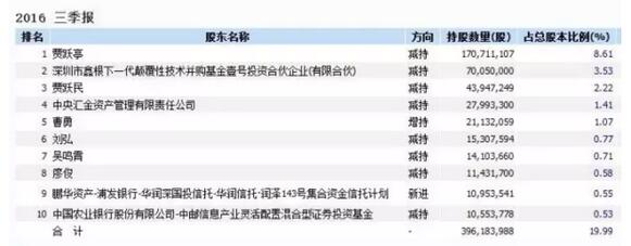 從樂視三季報披露的前十大流通股東來看,自然人持倉達到1000萬股以上的有6人,機構持倉分別有深圳市鑫根下一代顛覆性技術并購基金壹號投資合伙企業、中央匯金資產管理有限責任公司、華潤信托·潤澤143號集合資金信托計劃、中郵信息產業混合基金等。
