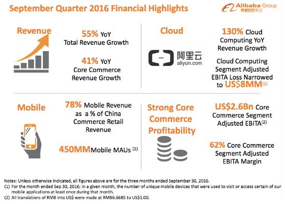 周四,阿里也發布了發布了該公司截至9月30日的第三季度財報,當季集團收入同比增長55%,達342.92 億元人民幣;核心電商業務收入同比增長41%,達284.93 億元人民幣;移動月度活躍用戶單季度凈增2300 萬至4.5 億,相關市場指標超越美國華[0.00%]爾街對其的預期。按照阿里巴巴的說法,凸顯了以數據驅動的新零售經濟體強勁增長動力。
