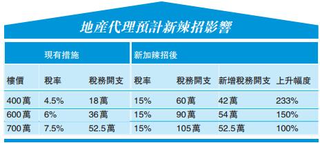 以一個樓價400萬元的細價單位計算,已擁有物業的港人,加稅前要繳交4.5%,相當於18萬元的雙倍印花稅,加稅後,稅率調高至15%,印花稅增至60萬元,增幅超過40萬元,相當於樓價超過一成。購買樓價600萬元的物業的應繳稅務開支,將由36萬元增至90萬元;購買樓價700萬元的物業的應繳稅務開支,更由52.5萬元增至105萬元。