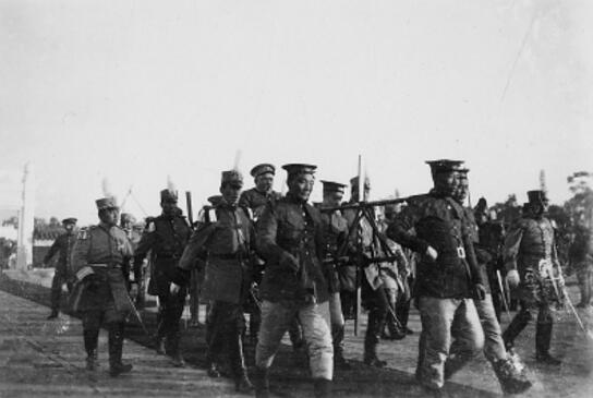 1912年10月10日,在武昌起義一周年之際,袁世凱站上了作為臨時大總統府的前清陸軍部衙前的閱兵臺。他所檢閱的部隊并不是自己一手打造的北洋新軍,而是包括前清遺留的拱衛軍、禁衛軍等衛戍部隊11000余人。受閱隊伍沿今天的崇文門內大街、東單大街北上,行至陸軍部東南角后轉向西,逐次經過閱兵臺,接受袁世凱的檢閱。詹布魯恩就在檢閱臺對面拍攝了這次閱兵,這是袁世凱第一次出現在他的鏡頭里。
