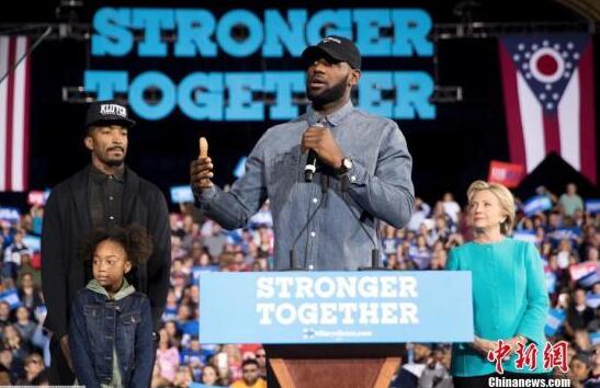 資料圖:當地時間2016年11月6日,美國克利夫蘭,勒布朗·詹姆斯與JR·史密斯為希拉莉拉票,現場,小皇帝發表演講。