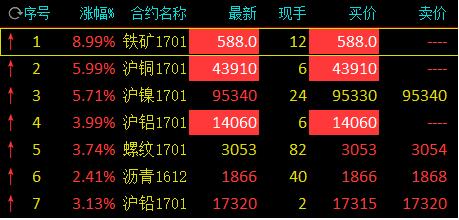 今日,鐵礦石期貨開盤漲停后略有回落,但目前已經再度漲停;滬銅、滬鋁再度漲停,螺紋鋼同樣一度觸及漲停;滬鎳漲5.5%,焦炭漲3.6%,焦煤漲2.2%。