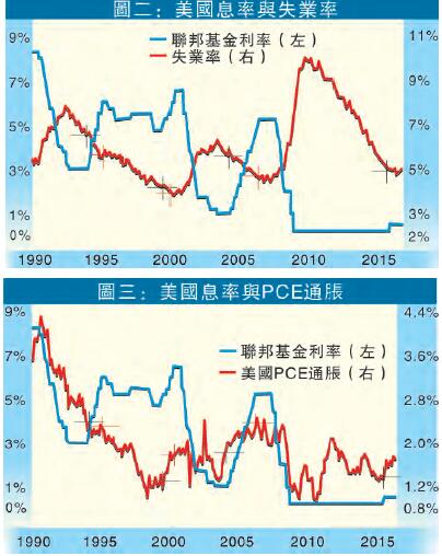 筆者以美國聯邦基金利率與失業率作對比,圖二見到由1990年計起至今的最近幾次加息周期,通常失業率低至7%便會開始加息(黑十字)。如果以去年12月聯儲局加息時失業率已跌至5%以下,聯儲局加息似乎真是遲了一點。