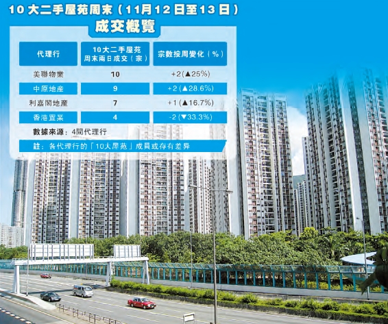 4間代理行中,美聯是唯一一間聲稱錄雙位成交。美聯物業住宅部行政總裁布少明表示,據美聯分行統計,過去兩日,10大藍籌屋苑合共錄約10宗買賣成交,按周上升約25%(升約兩宗),情况較加辣后首個周末(5日至6日)有好轉,惟零成交屋苑仍有4個。