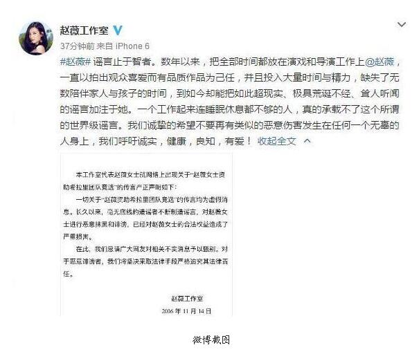 11月14日凌晨,赵薇工作室更新微博,否认“赵薇资助希拉里团队竞选”传闻的真实性,附文称“谣言止于智者。数年以来,把全部时间都放在演戏和导演工作上@赵薇,一直以拍出观众喜爱而有品质作品为己任,并且投入大量时间与精力,缺失了无数陪伴家人与孩子的时间,到如今却能把如此超现实、极具荒诞不经、耸人听闻的谣言加注于她。一个工作起来连睡眠休息都不够的人,真的承载不了这个所谓的世界级谣言。我们诚挚的希望不要再有类似的恶意伤害发生在任何一个无辜的人身上,我们呼吁诚实,健康,良知,有爱!”声明中还表示,对于恶意诽谤者赵薇工作室将采取法律手段严格追究其法律责任。