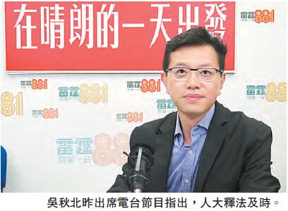 吳秋北表示,立法會宣誓風波令立法會停頓,令香港發展受影響,人大就《基本法》第104條作出釋法,是維護領土完整、國家安全,及時止息紛爭,令法庭有更明確依據處理事件。他續指,人大釋法並不會牴觸到法庭的判決,法庭要依據本地法例作出判決,反之不釋法會令各種演繹及官司的技術問題更不確定。至於有哪些議員不應該再留在立法會?吳秋北表示,大家可由其宣誓紀錄及言行看出議員是否誠心效忠,是否合資格就由法庭判決。
