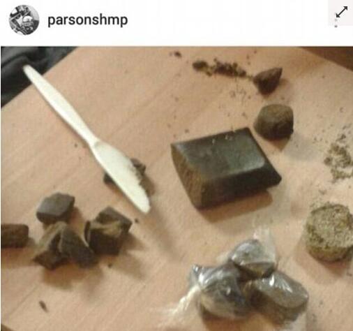 图为犯人拍摄的走私进来的外卖汉堡和鱼条。左上角的粉末疑似是印度大麻,估价超过100英镑。
