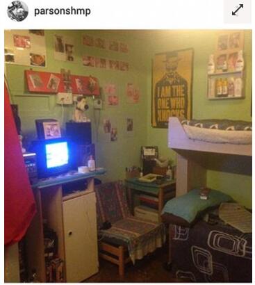 这是帕森斯在监狱里的房间,里面有一个电视,绿色的墙上贴满海报和个人照片,看起来如同一个大学生的房间。