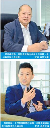 曾参选今届立法会金融服务界议员的詹剑仑接受本报访问时指出,「合适性」问题为证监会留下大量空间去否决日後的上市申请及融资活动,因而影响到香港作为集资中心的地位。香港会计师公会上月就谘询文件提交的意见书亦指,须澄清证监会如何与上市科合作,以确保只有涉及「合适性」问题及对上市政策产生影响的个案,才会转交LRC处理。