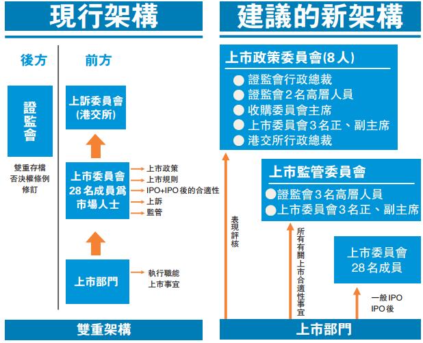 当年该专家小组建议,港交所上市委员会改属证监会,职责由处理上市审批改为负责上诉个案,同时解散上市科。经各方妥协後,2003年实施俗称「证券大法」的《证券及期货条例》,上市委员会及上市科同获保留在港交所架构内,至於港交所及证监会互相制衡的权力架构,亦因为证券大法的实施而得以确立。