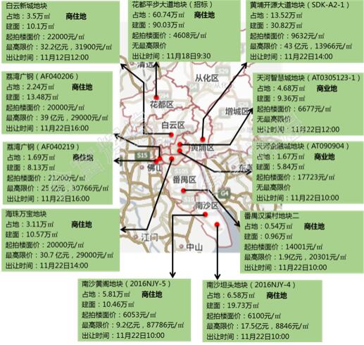 10月20日,廣州市國土局一口氣推出了11宗地塊,涉及8個區,包括純住宅、商業、商住等,掛牌總價1882586萬元。緊接著在10月26日,廣州再推8宗地塊,起始價總價約為72.8億元。據悉,地塊將在11月25日分時段競價,所有住宅地競買保證金都為50%,且設有最高限制地價。