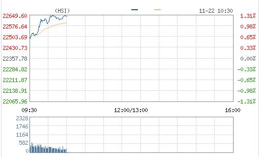 隔夜美股三大指數齊創盤中及收市紀錄新高,市場繼續等待“深港通”落實啟通日期。恒生指數今早高開0.6%,重上10天線(約22400點),開盤后漲幅擴大,最高漲近300點,高見22649點,截至發稿,恒生指數漲1.24%,報22633點,成交額207.69億元。