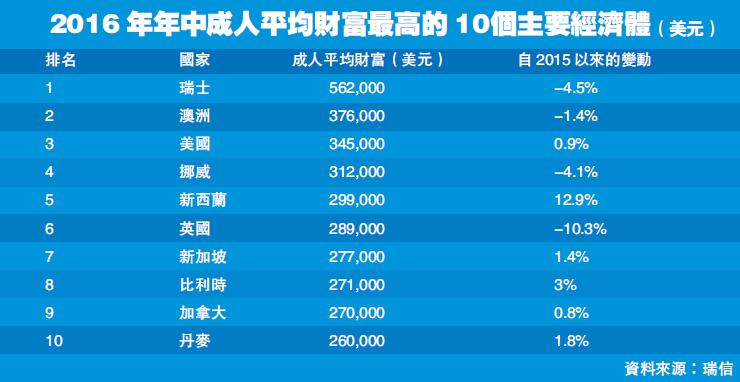 反觀全球方面,按成人平均財富計算,瑞士仍然是全球最富裕的國家,今年的成人平均財富為56.2萬美元,其次是澳洲為36.7萬美元,第3名是美國為34.5萬美元。