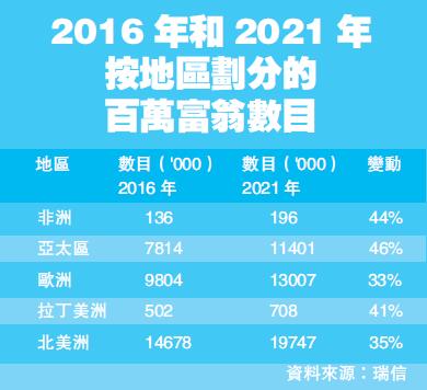 報告指,未來5年,內地的財富增長有望保持強勁升勢。以按年增長9.2%計算,預計到2021年,財富總值將達36萬億美元,但增幅料將低於2000年至今年的11%。內地目前的百萬富翁人數為160萬,財富總值達6.6萬億美元。以按年增長11.6%計算,預計到2021年百萬富翁人數將達270萬。