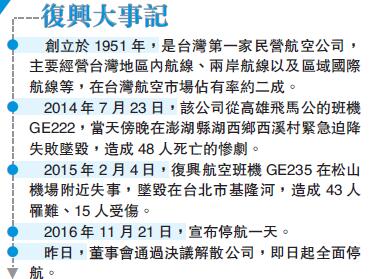 【香港商報网訊】停航一天的臺灣復興航空,昨日上午召開臨時董事會通過解散決議,并於下午召開記者會宣布解散。董事長林明升表示,由於財務狀況惡化,將退出臺灣航空業,即日起全面停航。這代表成立65年的臺灣第三大航空公司走入歷史。