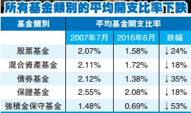 報告顯示,所有強積金類別的基金開支比率均有所下跌,而持續呈現下跌趨勢。強積金基金的平均基金開支比率,從2007年7月2.06%,下跌24%至2016年10月的1.56%,為紀錄以來的最低水平。